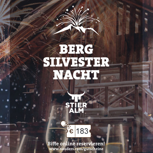 - Berg.Silvester auf der Stieralm GENUSS.MENÜ - BERG.FEUERWERK - PANORAMABLICK - MUSIK TANZ Ab 17:30 Uhr Skibusstransfer von Nauders zum Seilbahncenter